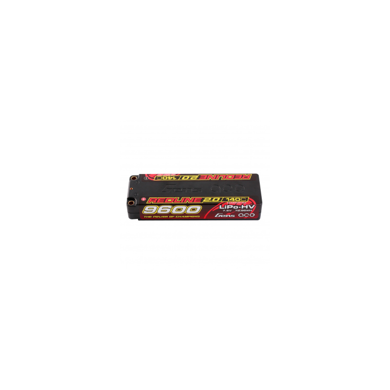 Gens Ace Redline 2.0 Series 2S 140C 9600mAh Hardcase LiPo Battery Pack, with a factory installed 5.0mm bullet. Consumers trust the Gens Ace name to deliver the dependability and high performance they expect. The Gens Ace 140C 2S 9600mAh 7.6V HV LiPo battery pack has a high-capacity, high-discharge rate that gives you the power and run-time you expect .