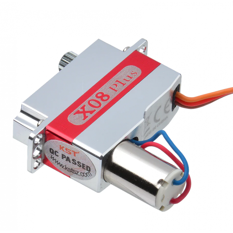 It is especially good for ailerons on F5J gliders, electric racers, and all models with thin flying surfaces. Despite being only 8 mm thick the powerful coreless DC motor and gearing provide good torque and high speed. The X08 Plus can be operated from a voltage as low as 3.8V (1S LiPo) or as high as 8.4V (2S LiPo). KST servos have excellent geartrain machining tolerances, and this servo is completely slop-free and equal to products costing twice as much. Despite not having an -MG moniker this servo has metal gears and is very tough.